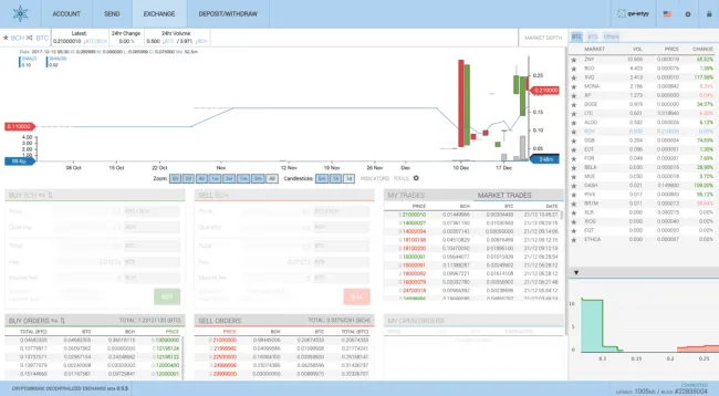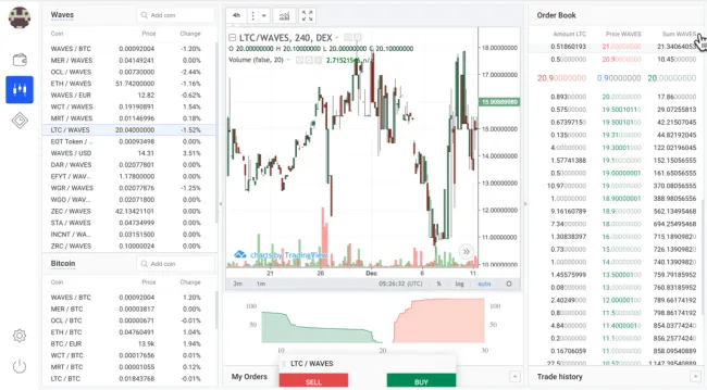 Ako už názov napovedá, táto decentralizovaná burza je dielom developerov kryptomeny Waves. Svojim klientom umožňuje obchodovať 64 obchodných párov. V čase písania článku sa denný volume pohybuje mierne nad 5 miliónov USD (793 BTC), čo je na decentralizovanú burzu slušné číslo. Najviac obchodovaným párom je WAVES/BTC a BCC/WAVES.
