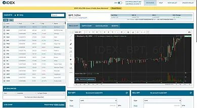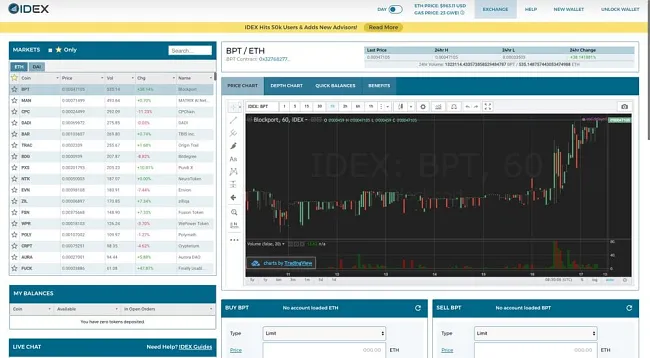 IDEX je populárna decentralizovaná burza, ktorá vám umožňuje ľahko obchodovať ERC-20 tokeny. Je to najlepšia alternatíva voči kryptobuzre EtherDelta, ktorá je rovnako určená na obchodné páry Ethera a ERC20 tokenov. Okrem užívateľsky prívetivého prostredia sa vyznačuje aj najvyššími zobchodovanými objemami spomedzi decentralizovaných búrz. Zároveň získate prístup aj k analytickým nástrojom na vykonávanie vlastných technických analýz.