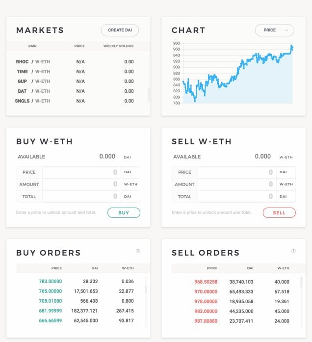 Oasis Dex je ďalšia decentralizovaná burza, ktorú má na svedomí spoločnosť MakerDao. Momentálne je ešte v alfa testovacej fáze a ponúka len tri obchodne páry, menovite ETH / DAI, MKR / ETH, MKR / DAI. Denný volume je približne 200 tisíc USD.