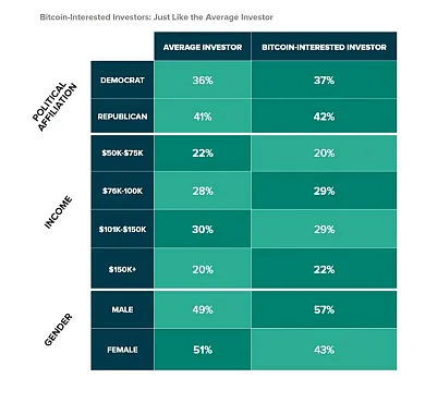 Zatiaľ čo investori, ktorí vlastnia Bitcoin môžu byť o niečo skúsenejší a tolerantnejší voči rizikám ako tzv. štandardný investor, ich politické názory, úrovne príjmov a profesie sa veľmi podobajú. Podľa výskumu je pomerne zložité odlíšiť štandardného a bitcoinového investora. Navyše názor, že kryptomeny vlastní len mladšia generácia je pomerne zavádzajúci. Pritom Grayscale zistil, že priemerný bitcoinový investor sa pohybuje vo vekovej kategórii od 42 do 45 rokov. V správe sa uvádza: