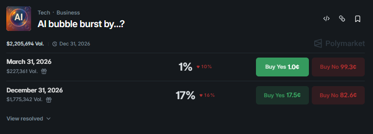 - Polymarket odhaduje pravdepodobnosť prasknutia bubliny do konca roka na 17 %.