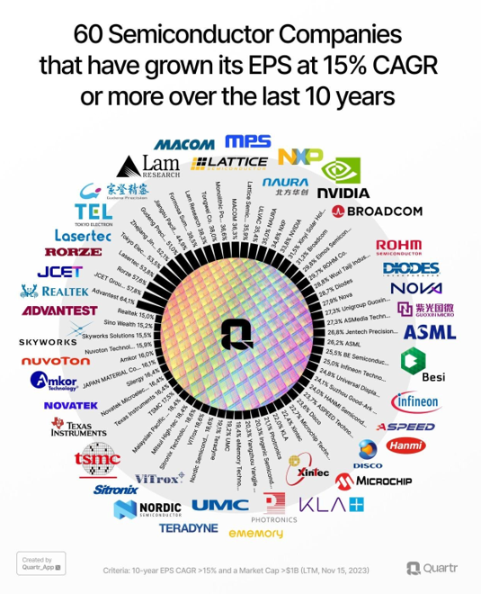 Mnohé spoločnosti vyrábajúce čipy zvýšili za posledné desaťročie svoj zisk na akciu (EPS) o viac ako 15 % ročne. Zoznam týchto spoločností spolu s ich priemerným ročným rastom EPS je uvedený na nižšie uvedenom obrázku.