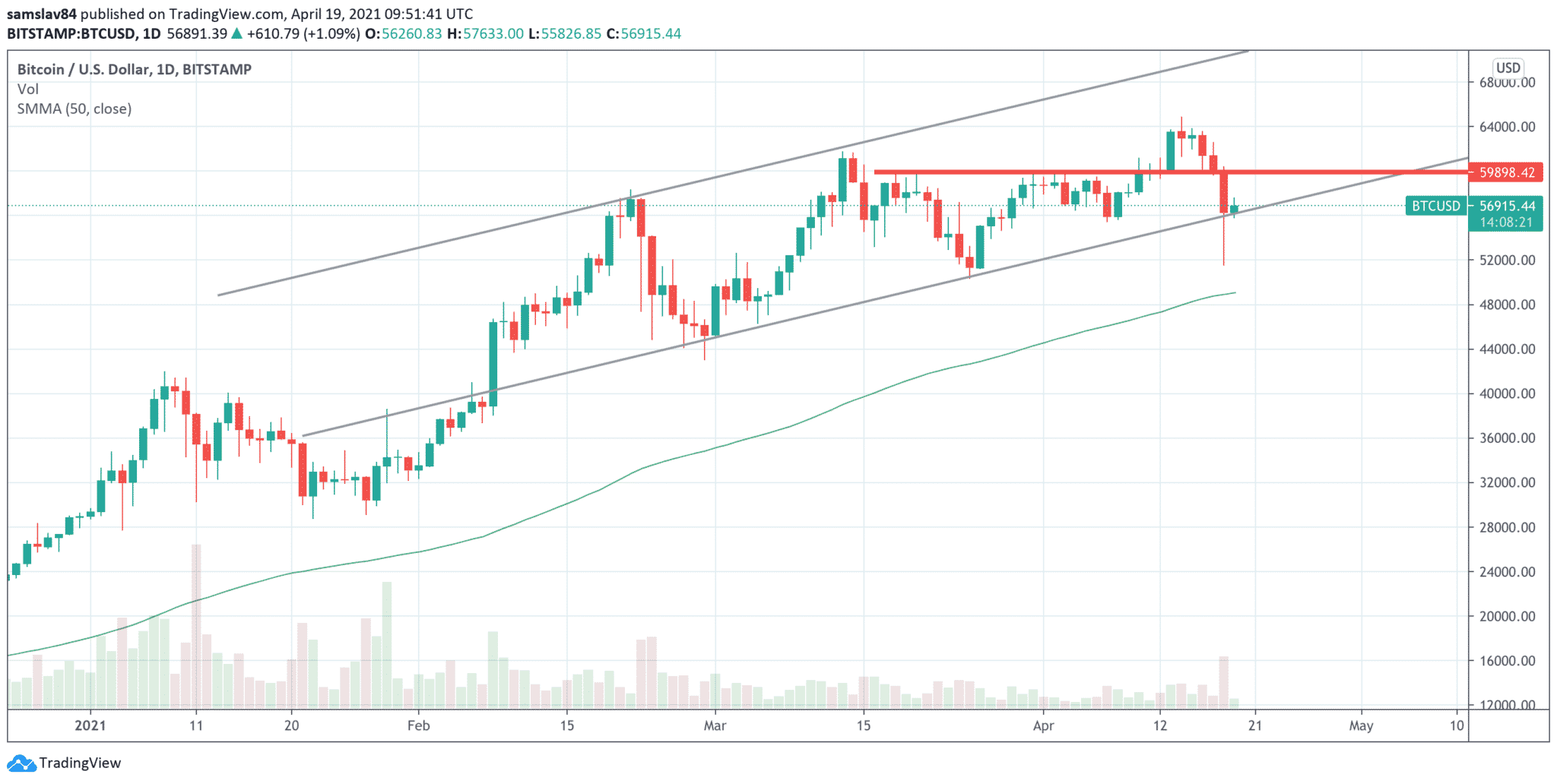Bitcoin včera zaznamenal najprudší pád v histórii. Behom pol hodiny padol o 7 500 dolárov a za celý deň to bolo takmer desať tisíc. Nakoniec sa však zdvihol späť hore a aktuálne sa už jeden Bitcoin obchoduje za úctyhodných 57 000 USD – 8 000 dolárov pod aktuálnym historickým maximom ($65 000).