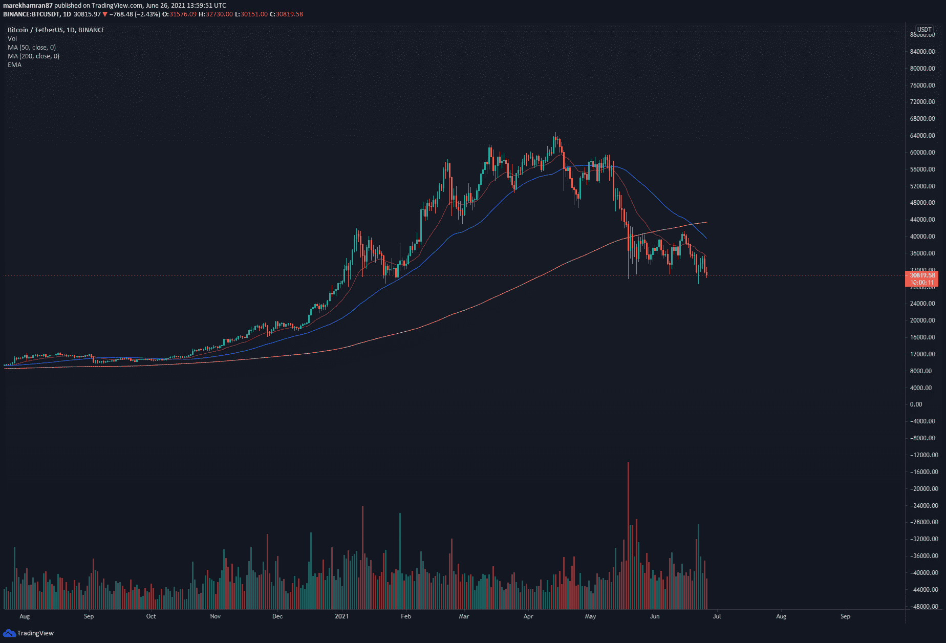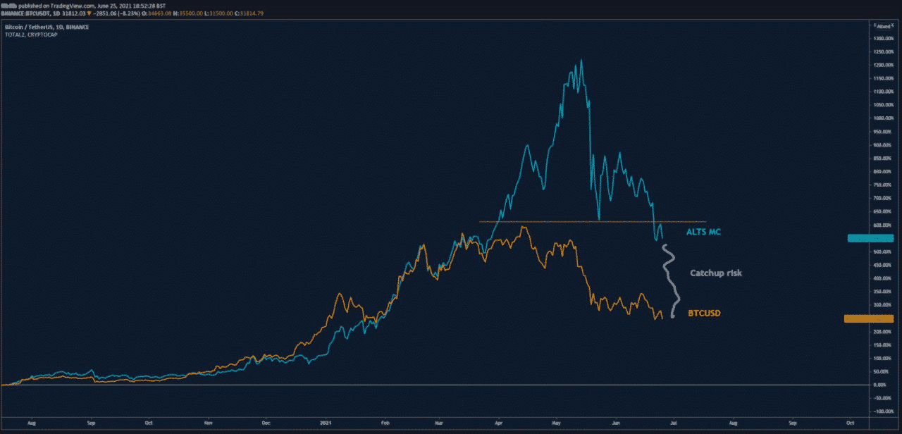 V období marca až mája tohto roka, keď Bitcoin konsolidoval na úrovni 50 000 až 60 000 USD, altcoiny vyslovene explodovali. Aj nedávna korekcia na trhu výrazne ovplyvnila pád altcoinov. Je teda jasné, že v súčasnosti je pohyb Bitcoinu najdôležitejší. Filbfilb poznamenal, že altcoiny čelia tzv. riziku dobiehania, čo by mohlo znamenať, že aj v prípade menšieho poklesu BTC, by mohli altcoiny padnúť dvojnásobne. Toto vyhlásenie prišlo práve v čase, keď sa Bitcoin dostal na úroveň 30 173 USD po týždňovej korekcii o takmer 16%.