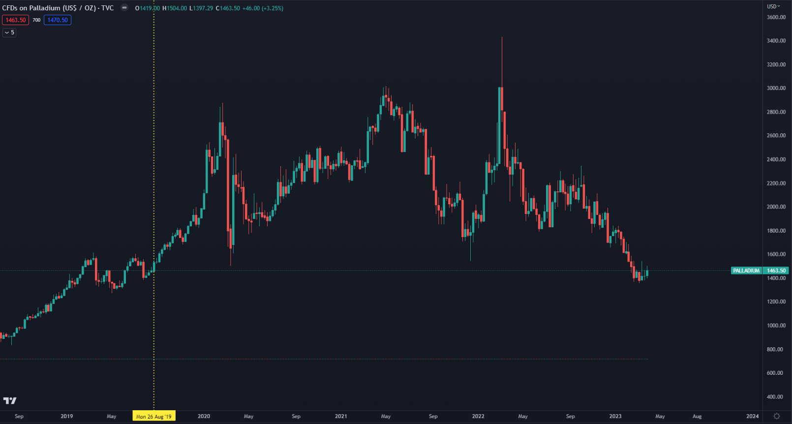 Podľa údajov z TradingView sa paládium obchoduje v čase písania článku na trhovej cene 1 463 dolárov a je na najnižšom bode od augusta 2019. To poskytuje príležitosť nákupu za nízku cenu. Cenový pád bol v poslednom roku spôsobený predovšetkým rusko-ukrajinským konfliktom, keďže Rusko je popredný dodávateľ kovu. Okrem toho bol ďalším faktorom aj prerušený dodávateľský reťazec a nízka investícia do projektov ťažby.