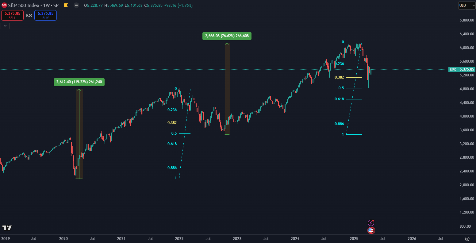 Fibonacciho úrovne sú často využívané ako psychologické aj technické hranice. V prípade indexu S&P 500 sú práve 50 % a 61,8 % považované za kľúčové úrovne podpory. Pokles indexu na 50 % úroveň zo svojho posledného maxima a následné zotavenie zodpovedá vzorcu, ktorý bol prítomný pri začiatkoch rastúcich trhov.