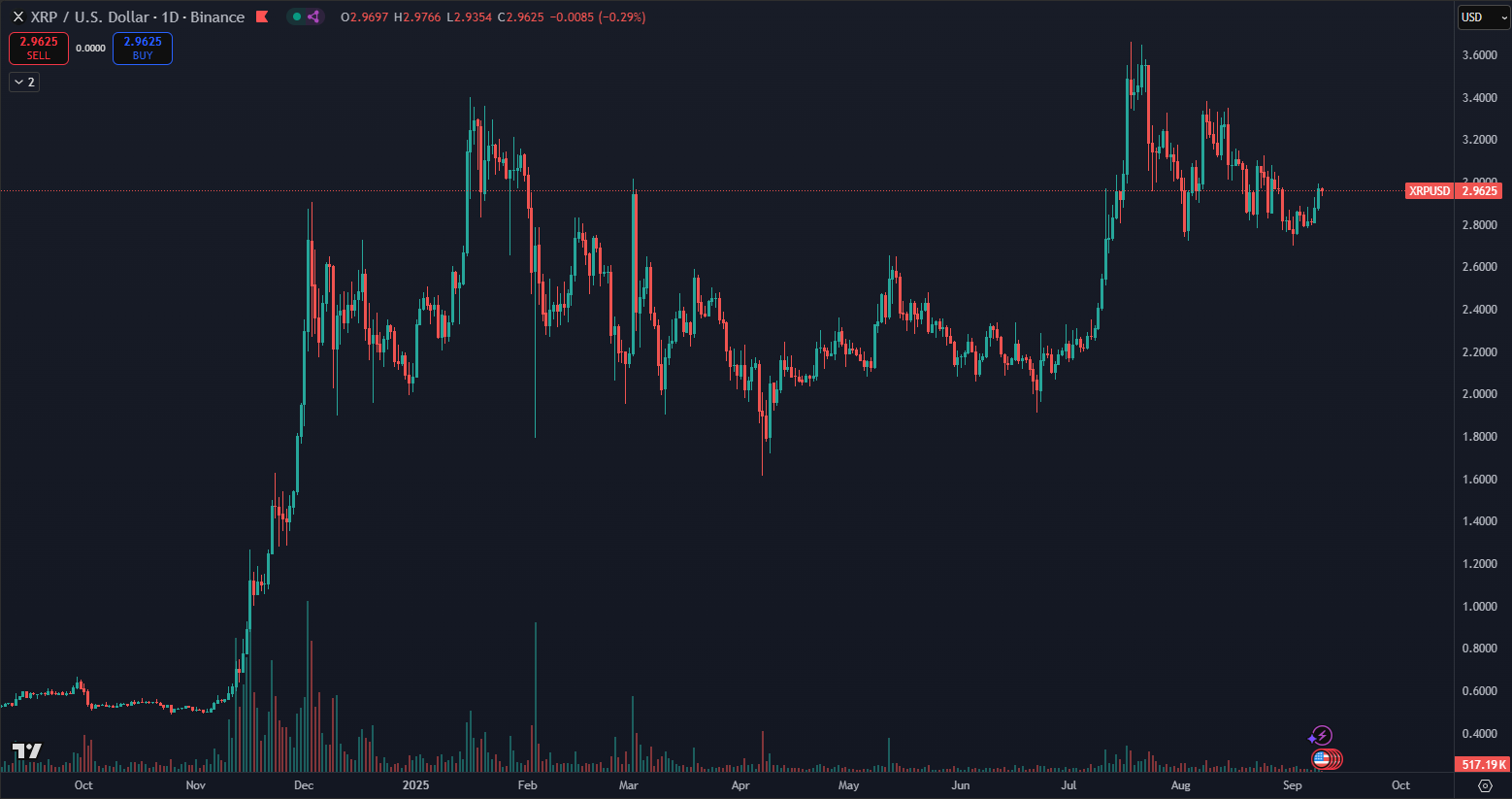 Podľa CoinMarketCap je XRP 3. najväčšia kryptomena na svete s trhovou kapitalizáciou približne 176,5 miliardy dolárov, čím si upevňuje významné miesto na trhu. Údaje z TradingView ukazujú, že aktuálna cena XRP sa pohybuje na úrovni približne 2,96 dolára. Kryptomena nedávno dosiahla nové historické maximum 3,66 dolára, čo potvrdzuje jej rastúcu silu a záujem investorov na globálnych finančných trhoch.