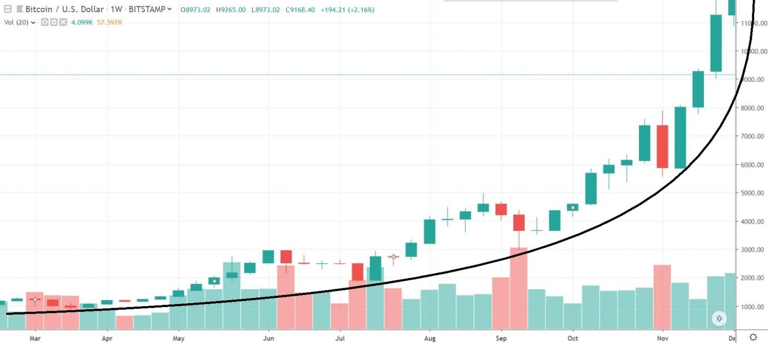 Aj graf Bitcoinu sa podobá na ten z roku 2017. Jasné stúpanie prerušené sériou menších korekcií a následných konsolidácií. Celkovo však krásne stúpame a ak si do grafu nakreslíme trochu plošší profil paraboly, ani ten exponenciálny rast ešte neskončil.