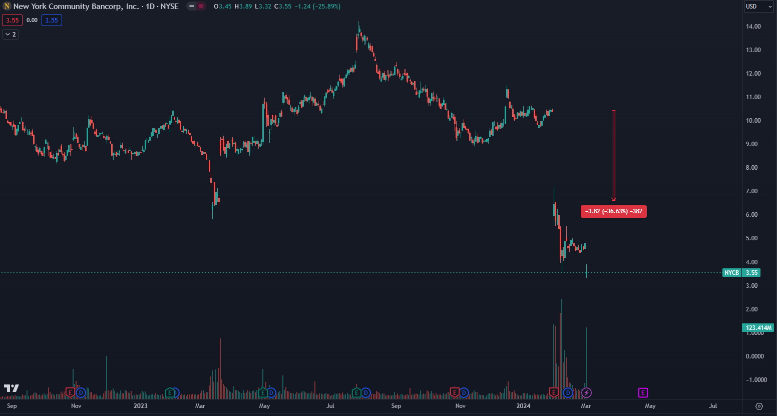 Len pre predstavu, hodnota akcií NYCB dosiahla vrchol 35 dolárov vo februári 2004. Dnes sa cena pohybuje v čase písania na hladine 3,55 dolárov. To znamená, že cena sa prepadla o 90 %. K mohutnému prepadu ale došlo len nedávno na prelome januára a februára 2024, kedy cena dokonca vytvorila medzeru až 36 % a preskočila cenové hodnoty medzi 10,50 a 6,50 dolármi. Celkovo hodnota akcií klesla od začiatku roka až o 66 %.