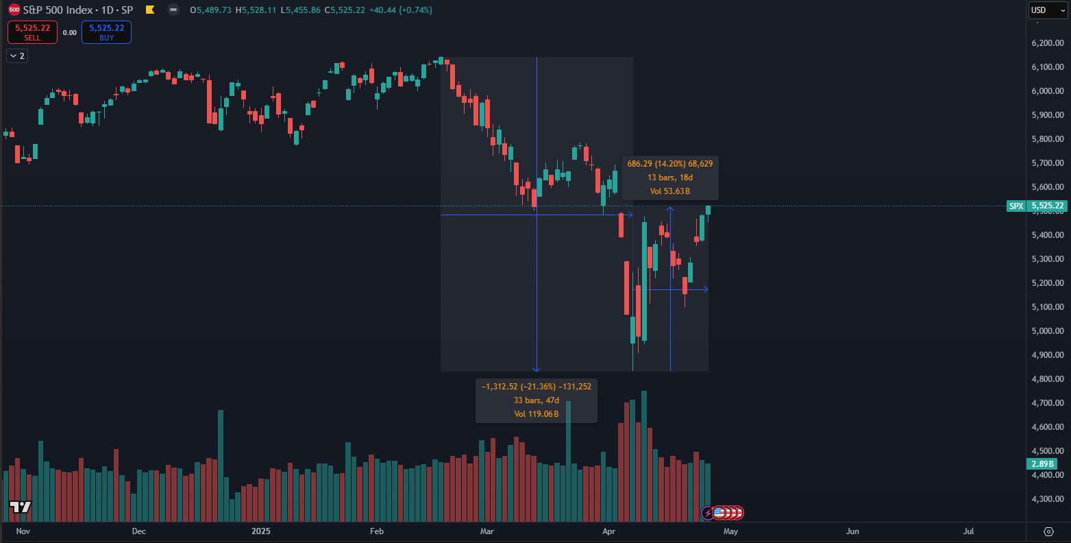 S&P 500 nedávno zaznamenal pokles o 21 % len za 47 dní. Následne sa cena zotavila o 14 % za posledných 18 dní. Zatiaľ nedokážeme predpovedať, či tento odraz predstavuje ukončenie dvojmesačnej korekcie.