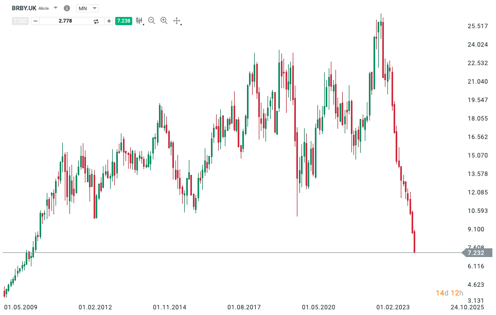 Z celého sektora sa aktuálne Burberry javí ako značka s najväčšími problémami. Akcie spoločnosti klesajú už viac ako rok a od svojich maxím už klesli o 70 % (viď. graf).
