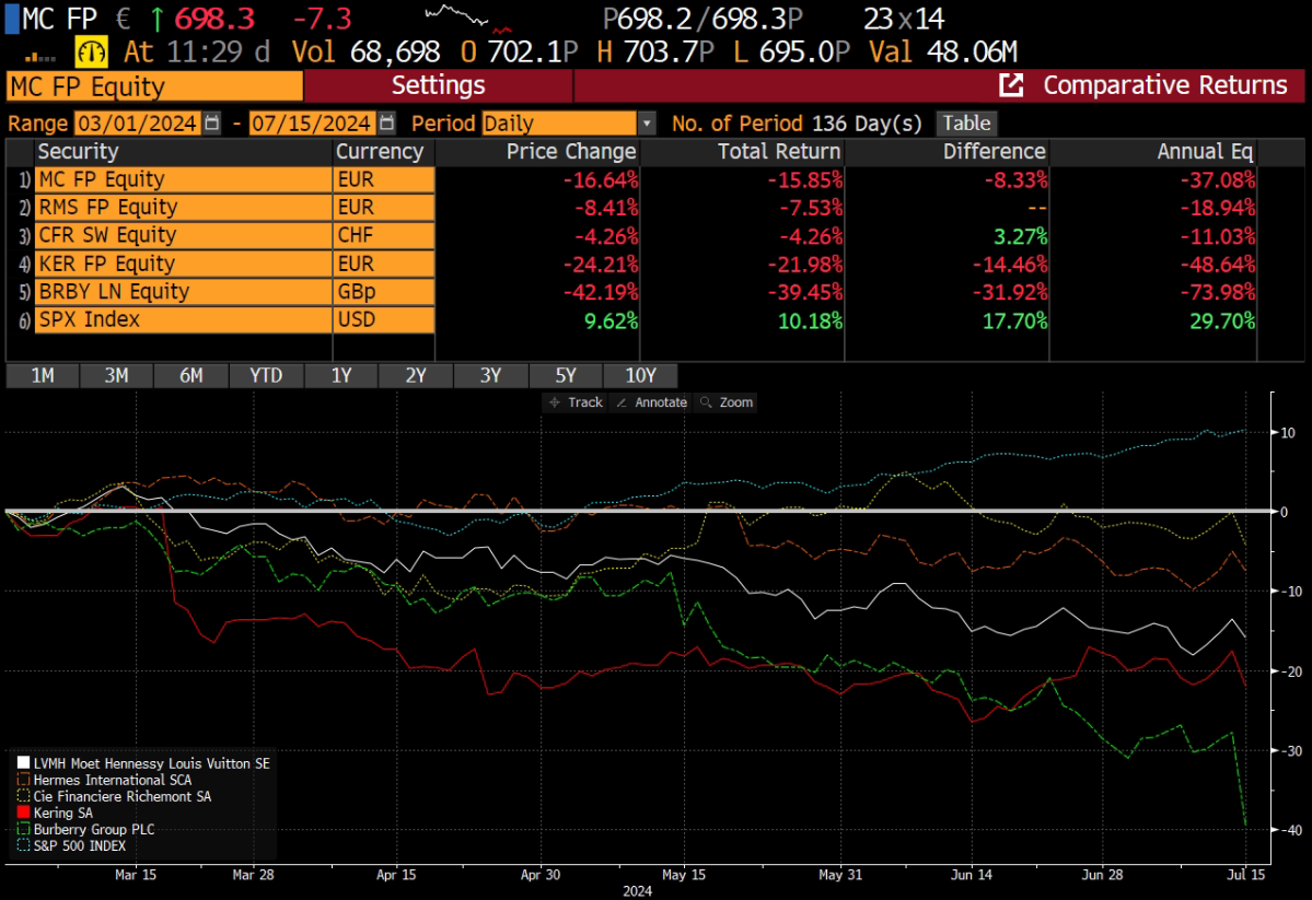 Segment teda v súčasnosti prechádza útlmom spojeným s poklesom dopytu a bude zaujímavé sledovať, ako sa budú akcie dotknutých spoločností vyvíjať v nasledujúcich štvrťrokoch. O niekoľko dní tiež začínajú olympijské hry v Paríži, kde je LVMH prémiovým partnerom, čo by malo spoločnosť trochu zviditeľniť.