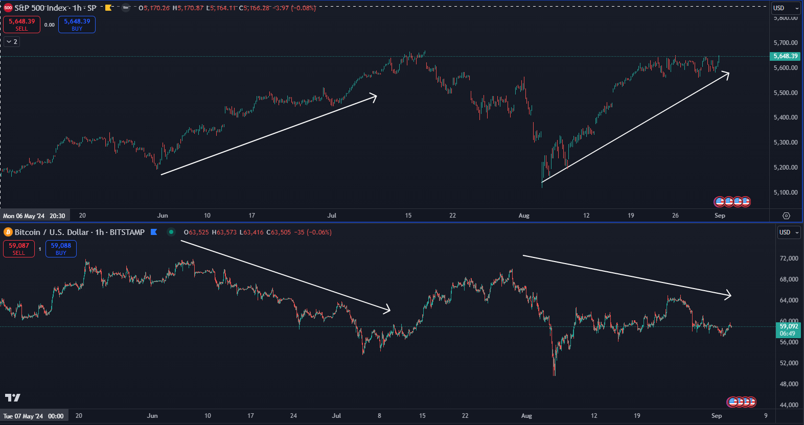 Pre lepšie pochopenie protichodného správania kryptomien si poďme porovnať cenový vývoj Bitcoinu a indexu S&P 500 za niekoľko posledných mesiacov. Všimnite si, že počas poklesu akcií klesol aj BTC, no počas rastu akcií pokračoval v korekcii a klesal (to v konečnom dôsledku všetky kryptomeny).