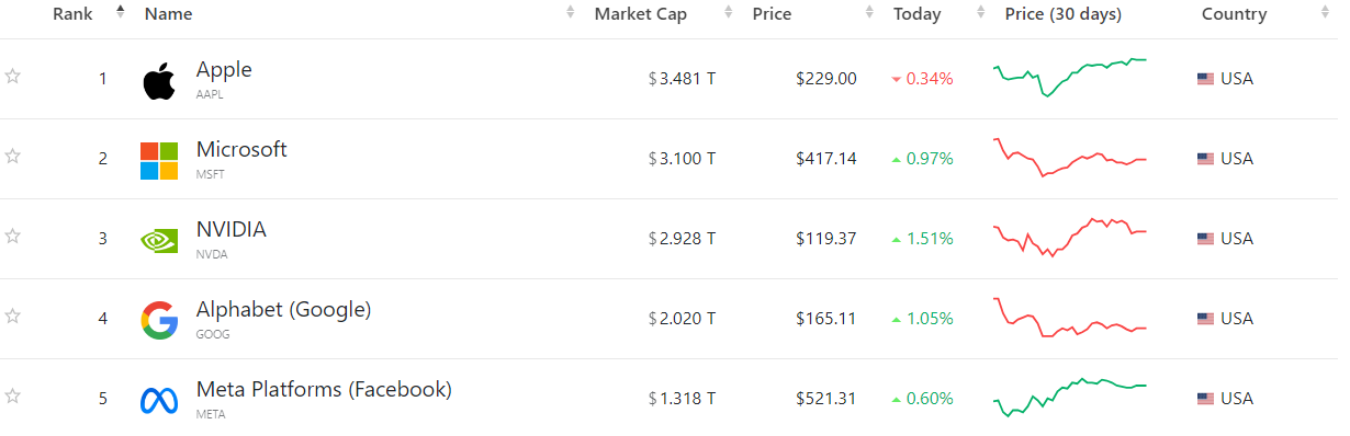 Podľa rebríčka Companies Market Cap patrí medzi najväčšie spoločnosti pôsobiace i v sektore umelej inteligencie práve Apple, Microsoft, Nvidia, Alphabet a Meta Platforms. Ide zároveň o firmy, ktoré ťahajú celý index S&P 500 a dosahujú kapitalizáciu nad 1 bilión dolárov.