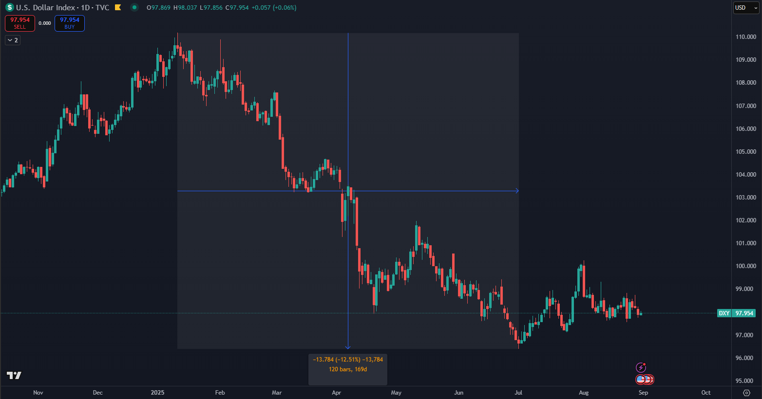 Dolarový index (DXY) zaznamenal rekordný pokles až o 12,50 % v tomto roku, čo odráža oslabenie dolára voči košu hlavných svetových mien. Pokles DXY signalizuje, že globálni investori uprednostňujú rizikovejšie aktíva, ako sú akcie či komodity, a oslabuje tlak na exportné meny, čo môže podporiť infláciu a rast cien zlata a striebra.