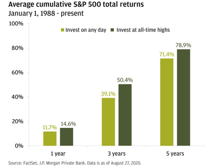 Toto tvrdenie potvrdzujú aj údaje americkej banky JP Morgan. Tie ukazujú, že ak by ste investovali v horizonte jedného roka od roku 1988, dosiahli by ste priemerný výnos 11,7 %. Ak by ste však investovali len v čase, keď bol trh na vrchole, výnos by bol až 14,6 %. V trojročnom horizonte bol priemerný výnos 39,1 %, zatiaľ čo v čase maxima je to 50,4 %, a v päťročnom horizonte je to 71,4 %, zatiaľ čo v čase maxima je to 78,9 %.