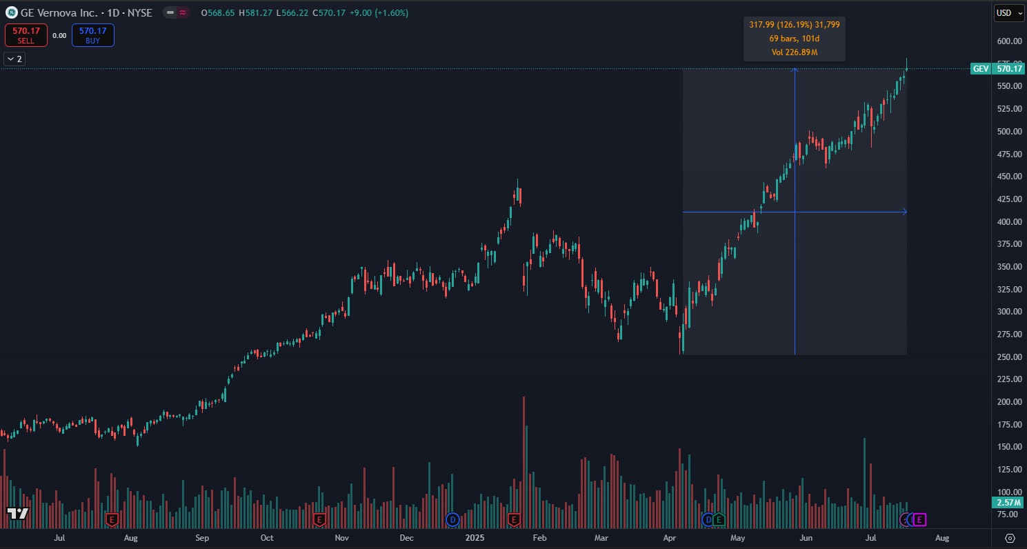 Akcie spoločnosti GE Vernova Inc. (GEV), ktorá sa v apríli 2024 oddelila od General Electric, aktuálne patrí medzi najziskovejšie na trhu. Podľa údajov TradingView zaznamenali nárast o 125 % za posledných 100 dní. Dokonca v rámci indexu S&P 500 sa s výnosom 73,34 % za rok 2025 zaradili hneď za Palantir a ide o druhú najziskovejšiu akciu, ukazuje rebríček Slickcharts.