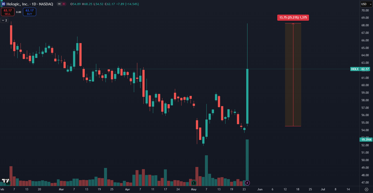 Akcie americkej spoločnosti Hologic zaznamenali prudký rast o 25 % za jediný deň, ukazujú údaje z TradingView. Vďaka tomuto masívnemu zhodnoteniu sa stali najziskovejšie v rámci indexu S&P 500 za posledných 24 hodín na základe rebríčka Barchart. Čo spôsobilo nečakaný vzostup?
