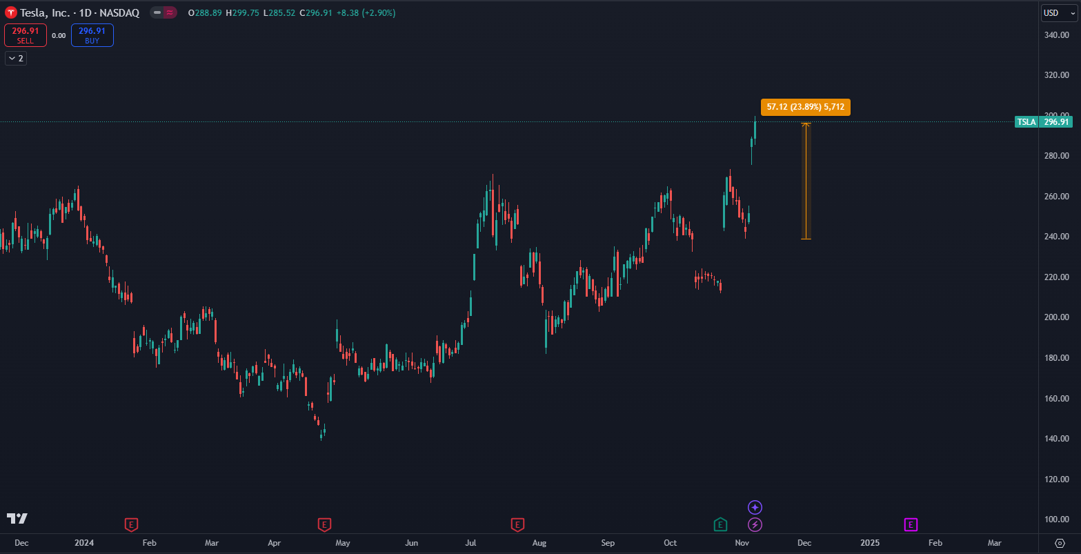 Akcie TSLA stúpli len za 4 dni o 25 %, pričom preskočili hneď niekoľko cenových úrovní. Naposledy sa akcie obchodovali na rovnakej úrovni v júli 2023 a od historického maxima ich delí ešte ďalších 39 %. Ak ale cenová dynamika bude pokračovať, zrejme sa nového maxima môžeme dočkať už v ďalšom roku.
