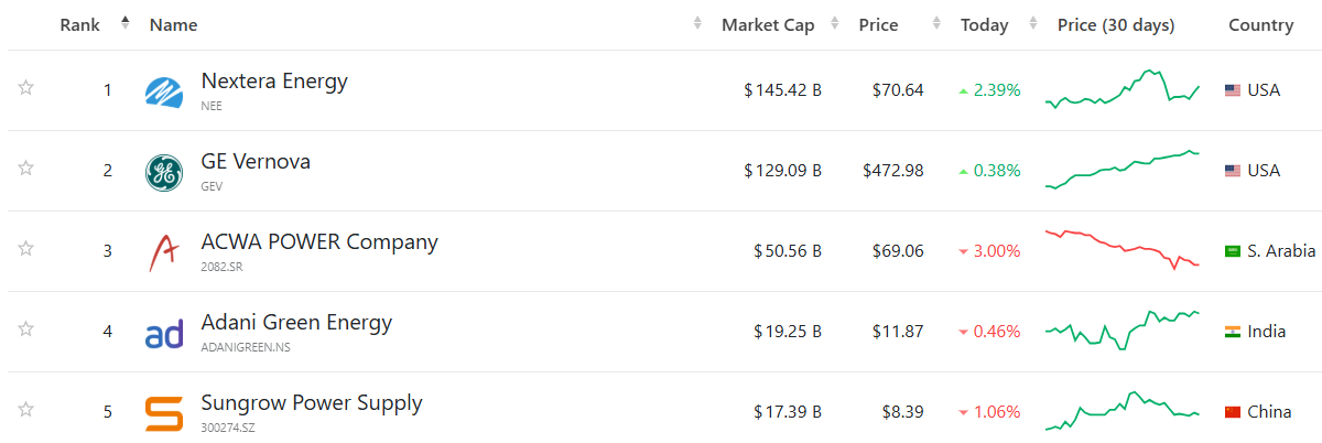 Najväčšie firmy v sektore obnoviteľnej energie. Zdroj: companiesmarketcap.com