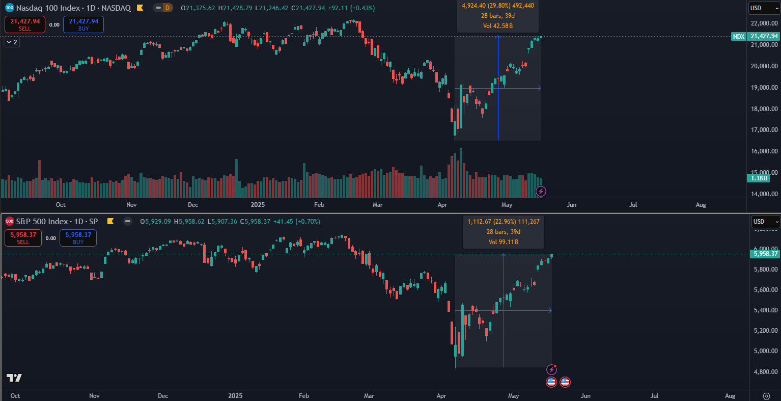 Index S&P 500 zaznamenal za posledných 40 dní výrazný nárast o 22,96 %, čo signalizuje silný rastový impulz na trhu. Ešte dynamickejší vývoj nastal pri indexe Nasdaq, ktorý v rovnakom období vystúpil o 29,80 %. Tento prudký vzostup poukazuje na návrat dôvery investorov a vysoké očakávania od technologických aj širších amerických akcií.