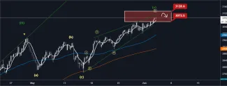 Na 4H grafe anotujem ako poslednú formáciu rising wedge. Rising wedge je pattern, ktorý by ste chceli vidieť na tope. Môj aktuálny target je 3 072 – 3 128 bodov. Aktuálne sme v targete. Je toto teda vrchol a môžem otvoriť short? To by som ešte s určitosťou nepovedal, pretože musíme počkať na odmietnutie. V ideálnom prípade by mal prísť pokles pod spodnú hranu formácie pri vysokých objemoch. To by mal byť jasný signál pre trh, že sme dosiahli top.
