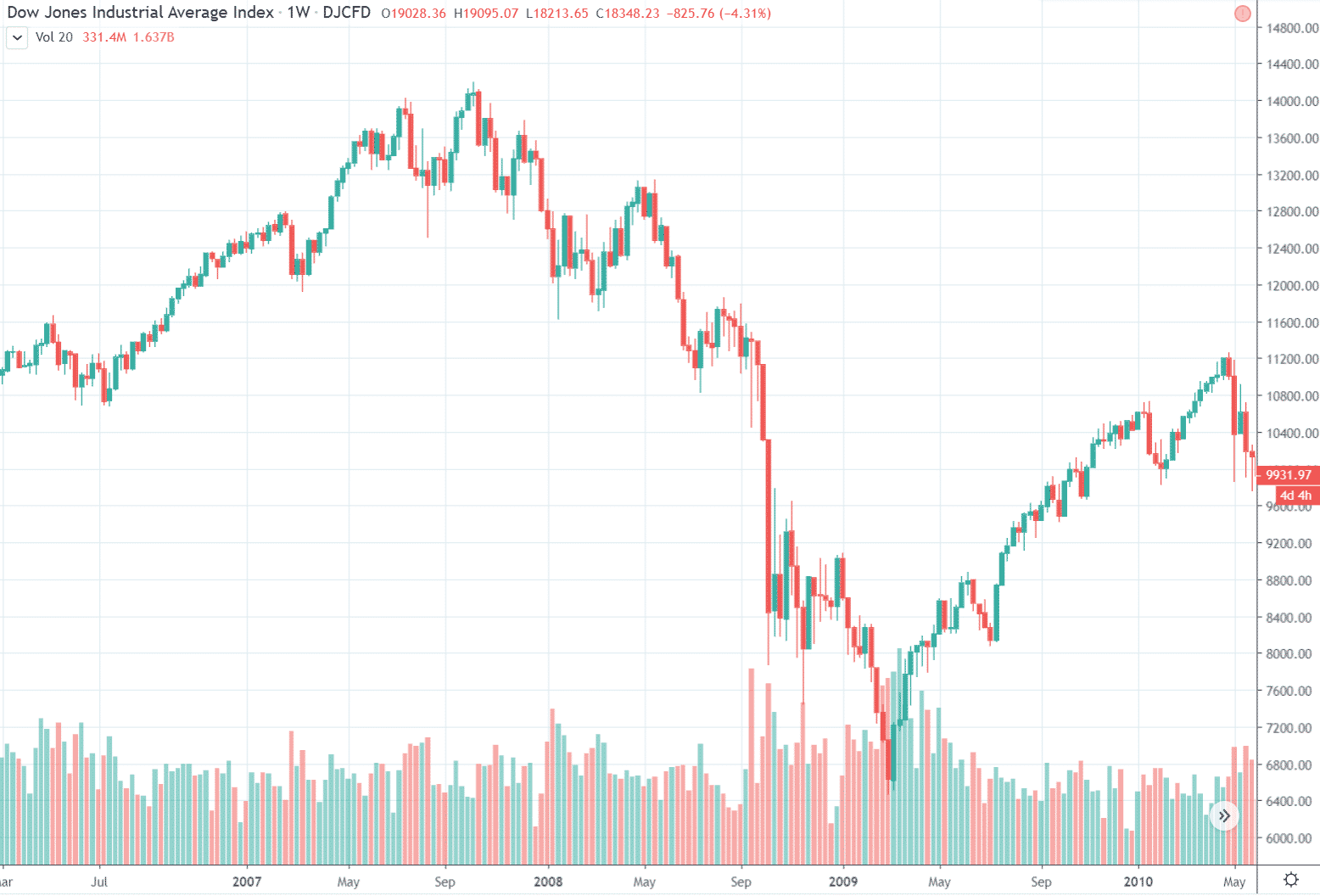 Tu sú grafy indexu Dow Jones Industrial Average v roku 2008 a 2020: