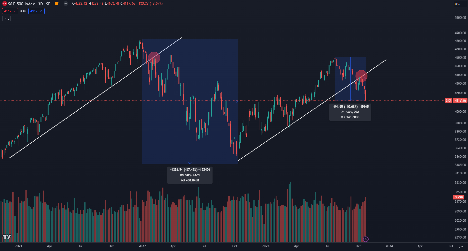 Jedným z hlavných faktorov prečo americké akcie klesajú je zhoršujúca sa makroekonomická situácia. Navyše, výnos 10-ročného štátneho dlhopisu USA dočasne prekonal rekord 5 %. Ide o negatívny signál pre akciový trh, pretože vyššie zisky pri bezrizikovom štátnom dlhu znižujú motiváciu nakupovať rizikové aktíva akými sú akcie.