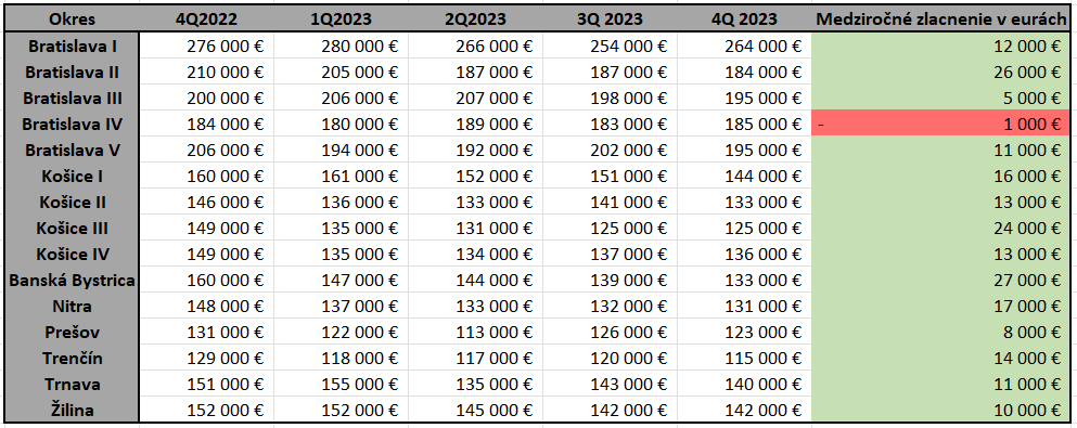 Detailné porovnanie cien dvojizbových bytov si môžete pozrieť v tabuľke nižšie. V prípade trojizbových bytov môžeme sledovať rovnaký trend, kde došlo medziročne k poklesu od 6 000 do 27 000 eur.