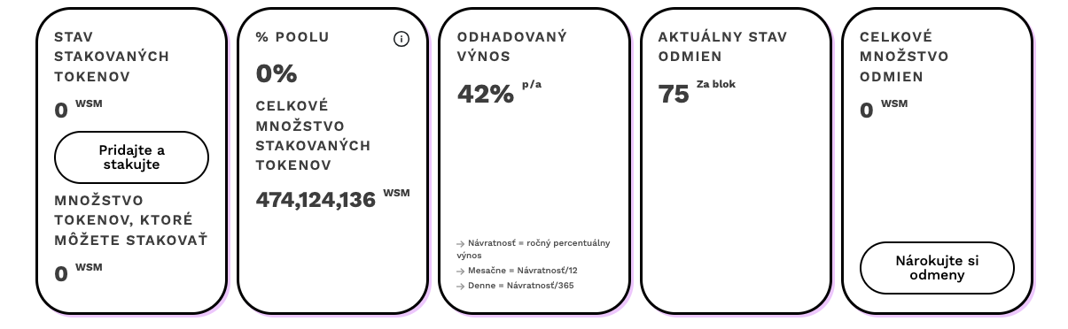 Okrem investovania do mincí Wall Street Meme projekt ponúka aj možnosť stakovania a spaľovania WSM. Keď sa ich rozhodnete stakovať bude vaša aktuálna odmena 42 %. Spálením zase prispejete k väčšej exkluzivite WSM, keďže projekt spáli rovnaké množstvo tokenov ako vy.