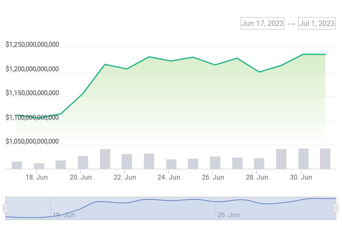 Po náročnom roku 2022 v dôsledku globálnej makroekonomickej neistoty a inflácie, má trh s kryptomenami v súčasnosti neutrálnu až mierne stúpajúcu dynamiku. Globálna trhová kapitalizácia kryptomien je 1,24 bilióna dolárov, čo predstavuje zvýšenie v porovnaní s 18. júnom. Vtedy dosahovala globálna trhová kapitalizácia kryptomien 1,10 bilióna dolárov.