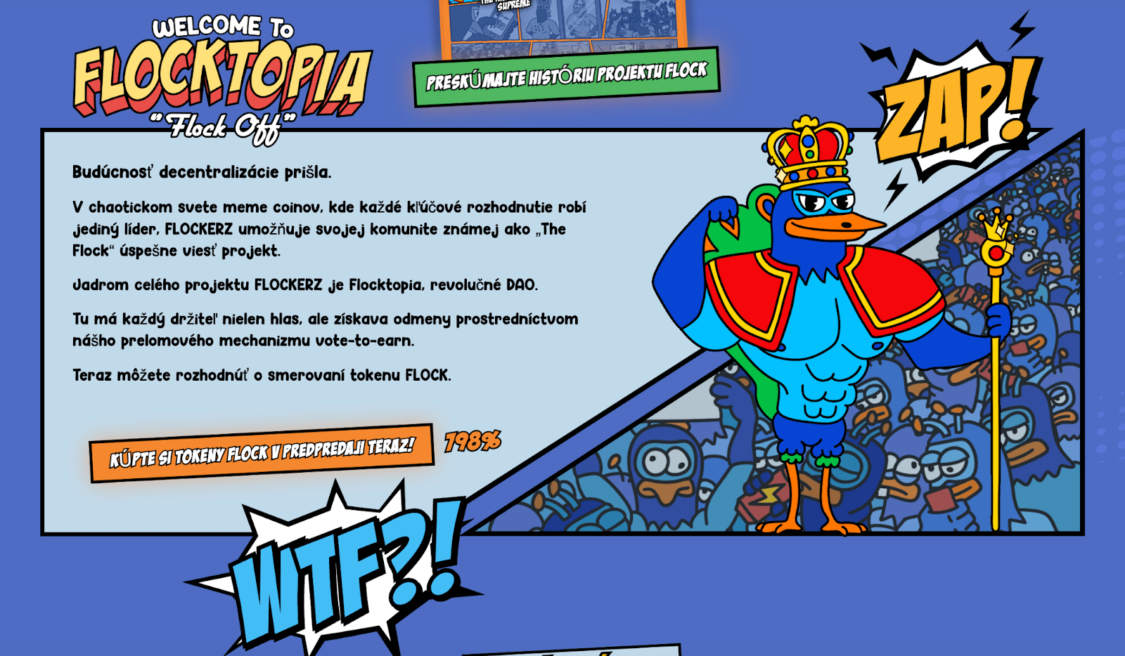 No popri meme tematike sa Flockerz môže pochváliť ešte jednou výraznou črtou. Jadro projektu tvoria jeho samotní majitelia – držitelia natívnych tokenov FLOCK. Ide o decentralizovanú autonómnu organizáciu (DAO) s názvom FlockTopia. Jej členovia majú všetku právomoc pri rozhodovaní o tom, ako bude vyzerať budúcnosť Flockerz.
