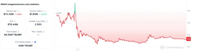 Token MAGA (TRUMP), meme coin inšpirovaný bývalým prezidentom Donaldom Trumpom, nedávno čelil volatilným výkyvom. Za posledný mesiac hodnota MAGA klesla približne o 53,10 % voči doláru. Tento prudký pokles hodnoty je z veľkej časti pripisovaný trhovým reakciám na politický vývoj a spustenie údajného oficiálneho Trumpovho tokenu, DJT, na blockchaine Solana.