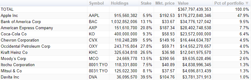 Na obrázku nižšie podľa údajov CNBC môžeme vidieť súčasnú hodnotu akciového portfólia Warrena Buffetta na úrovni 367 miliárd dolárov. Z toho takmer polovicu tvorí Apple s podielom 47,9 %. Tabuľka zobrazuje iba akcie s podielom v portfóliu viac ako 1 %, pričom sa pozrieme na cenový vývoj piatich najväčších.