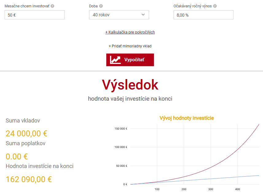 Investícia 50 eur mesačne 40 rokov. Zdroj: financnykompas.sk