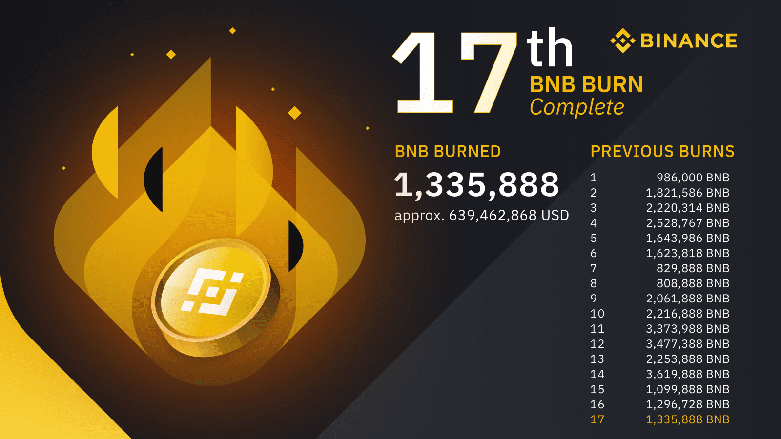 Pôvodný whitepaper burzy Binance uvádzal, že burza spáli 20 % svojich štvrťročných ziskov v BNB, ktoré zarobí. Whitepaper bol zmenený v roku 2019 za účelom odstránenia takéhoto systému, čo znamená, že už nie je jasné, koľko BNB sa spáli. Podľa posledných vyjadrení burzy sa priemerne každý štvrtok stiahne z obehu približne 2 milióny mincí. Ročne to teda vychádza na 8 miliónov. Vždy ale záleží od ziskov, ktoré burza má. V prepočte na celkové množstvo mincí, ktoré je obmedzené na 200 miliónov, burza priemerne ročne stiahne z obehu 4 %. Aktuálne namiesto pôvodných 200 miliónov je už v obehu iba 166 801 148 týchto kryptomien. Pálenie sa má zastaviť na počte 100 miliónov mincí, čo sa očakáva približne za 15 rokov. Od tohto momentu už nové mince nebudú vytvorené (čo nie sú, mimochodom, ani teraz) a nebudú ani žiadne stiahnuté z obehu. Pokiaľ to burza nezmení, bude daný presný počet 100 miliónov mincí BNB.