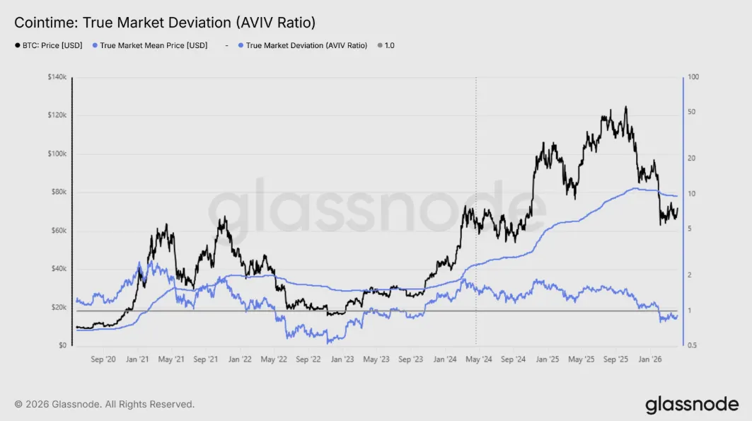 Na zhodnotenie hĺbky klesajúceho trhu slúži ukazovateľ AVIV Ratio, definovaný ako pomer spotovej ceny k skutočnej hodnote. Tento indikátor meria, ako ďaleko trh obchoduje nad alebo pod nákladovou bázou aktívnych investorov, a funguje ako valuačný barometer naprieč fázami cyklu. Aktuálna hodnota 0,92 umiestňuje súčasné prostredie do blízkosti trhového stavu z mája až júna 2022.