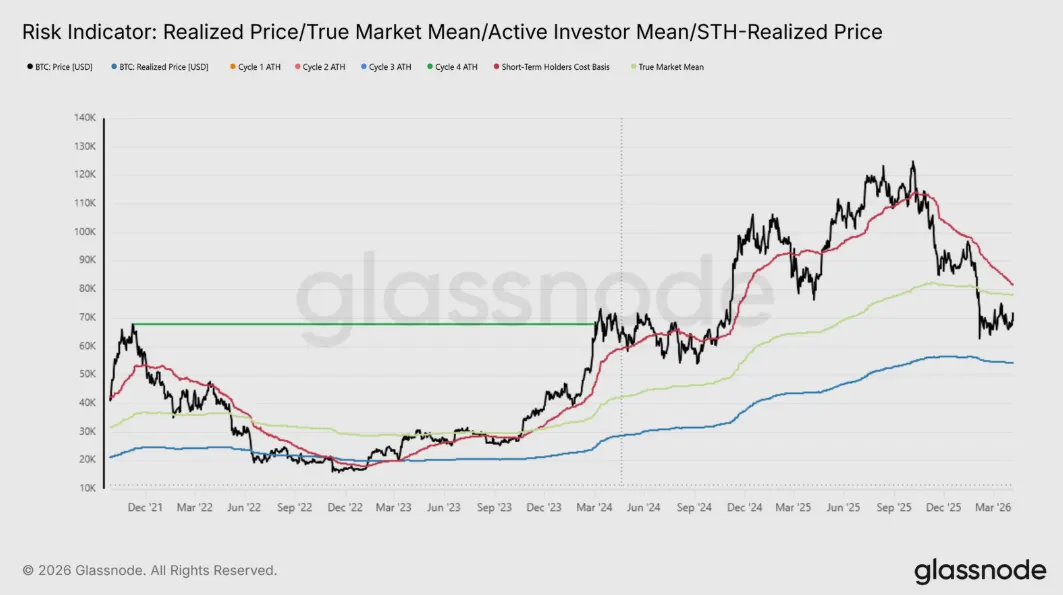 Porovnanie spotovej ceny s hlavnými on-chain oceňovacími modelmi odhaľuje, že trh zostáva štrukturálne v korekčnom teritóriu. Realizovaná cena na úrovni 54 000 dolárov predstavuje priemernú obstarávaciu cenu všetkých mincí v obehu (modrá krivka). Skutočná trhová hodnota na úrovni 78 000 dolárov tento výpočet zužuje iba na aktívne obchodované mince (zelená krivka). Tieto dve úrovne spoločne vymedzujú hranice súčasnej korekčnej hodnotovej zóny. Obchodovanie ceny v tomto pásme historicky zodpovedá trhu, ktorý ešte neprešiel do fázy udržateľného oživenia.
