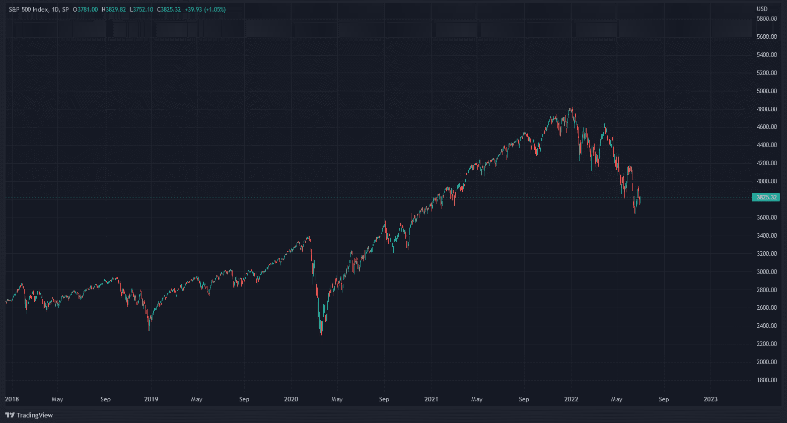 Klasická otázka, ktorú si kladú začínajúci, ale aj dlhodobí investori, je, kam až trh môže klesnúť. História sa ukazuje v tomto prípade opäť ako užitočný nástroj na potenciálnu predikciu cenového vývoja v rámci poklesov na klasických trhov. V minulosti, počas kríz a recesií sa najväčší index S&P 500 zvykol prepadnúť od 30 % až do 50 %. Jedným z indikátorov, ktorý môže poslúžiť ako identifikácia dna, je tzv. pomer ceny k zisku (P/E). Počas medvedích trhov v minulosti sa P/E pohyboval medzi 13 a 14 bodmi vtedy, keď S&P 500 dosiahol dno. Na konci júna sa 2022 forwardový pomer P/E indexu S&P 500 nachádzal na úrovni 15,8. Z tohto údaju môžeme teda vyčítať, že priestor pre ďalší pokles tu je, konkrétne na úroveň 3 235.