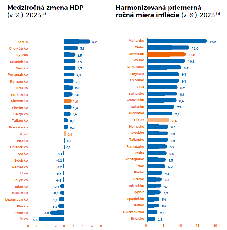 Z hľadiska inflácie sme na tom podstatne horšie ako väčšina krajín v EÚ. Harmonizovaná priemerná ročná miera inflácie za rok 2023 u nás dosahovala 11,0 %, čo je tretie najvyššie číslo po Česku (12,0 %) a Maďarsku (17,0 %).