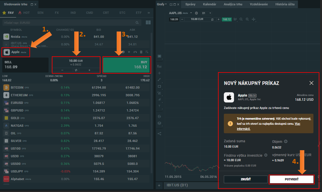 - Vyskočí vám okno s názvom „Nový nákupný príkaz”, v ktorom je zhrnutie objednávky a kliknete na „Potvrdiť”. V našom príklade nás XTB upozorňuje, že burza nie je otvorená a obchod sa preto nezrealizuje ihneď.