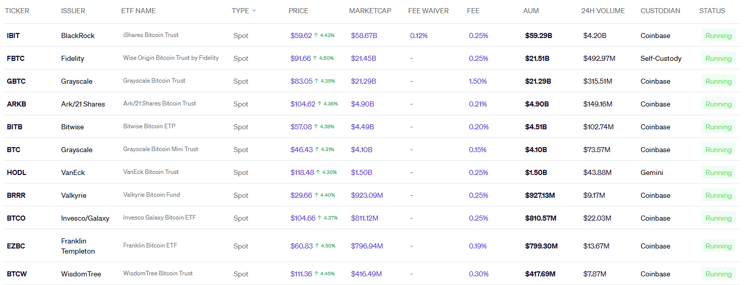 Zoznam spotových bitcoinových ETF. Zdroj: Blockworks