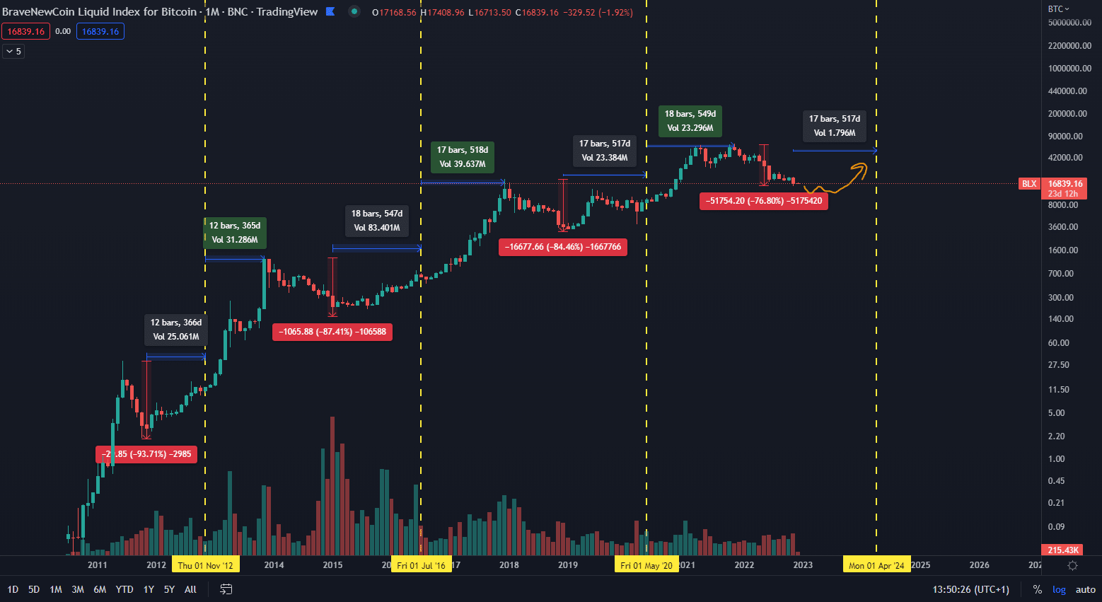 Okrem toho môžeme analyzovať aj časový rámec založený na halvingu. Ďalší halving je naplánovaný predbežne na 1. apríla 2024. To znamená, že trend by sa mal obrátiť najneskôr v polovici roka 2023. Predošlé minimá boli dosiahnuté približne 547 až 517 dní pred nasledujúcim halvingom. V súčasnosti je tento interval kratší, a preto čím dlhšie bude cene trvať otočenie trendu, tým skôr dôjde k porušeniu štvorročných cyklov BTC.