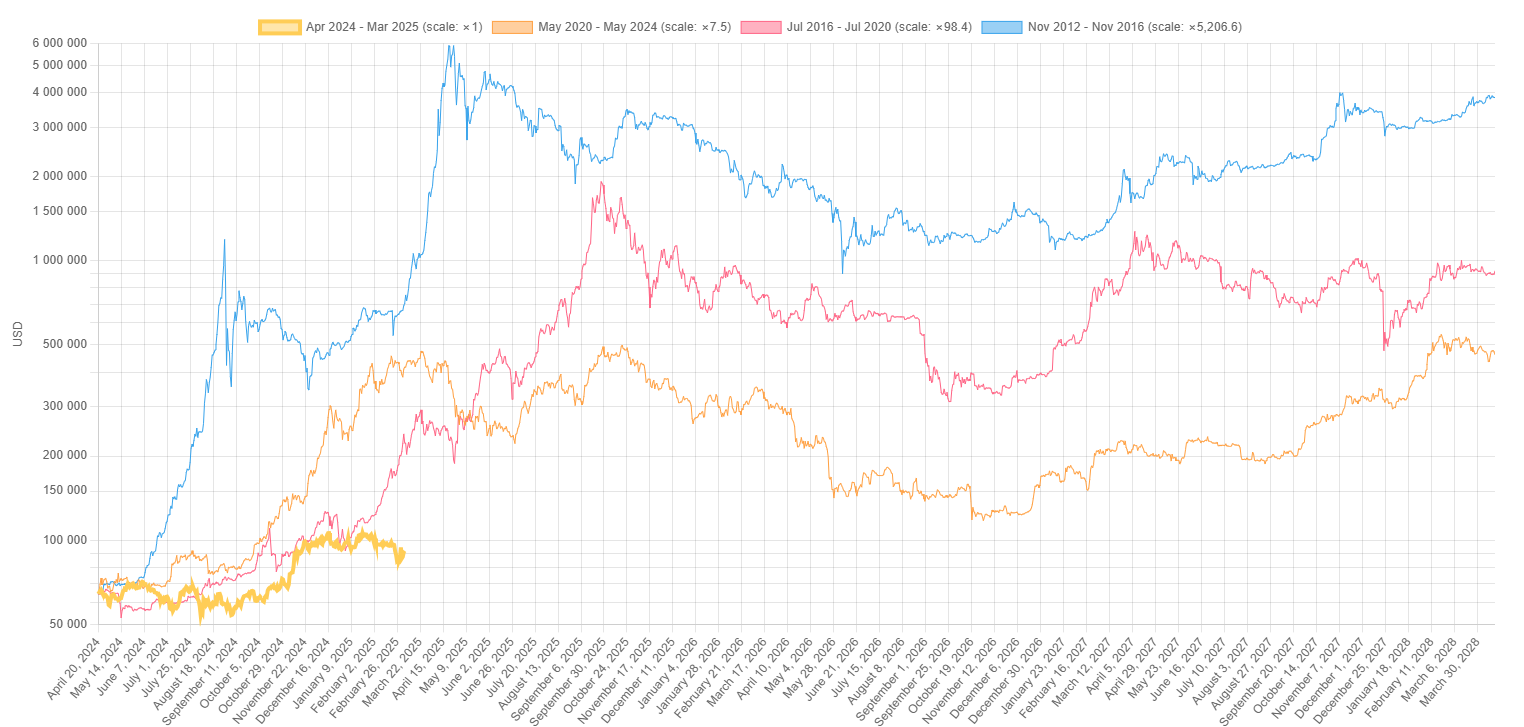 Je pravdepodobné, že Bitcoin už narazil na dno koncom februára a teraz budeme svedkami ďalšieho útoku na nové maximum. Z hľadiska cyklov je stále priestor na ďalší rast, čo dokazuje porovnanie cenových pohybov medzi halvingami zo stránky Bitcoin Cyclescomparison.