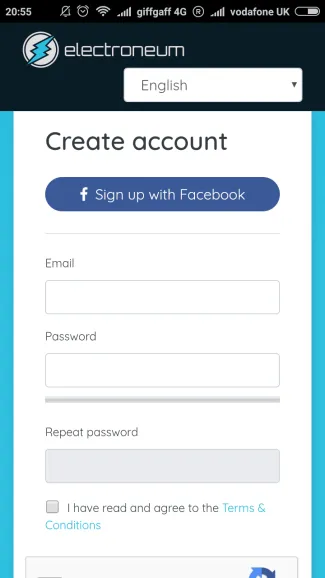 - Použite príkaz „SIGN UP VIA WEBSITE“ (zaregistrovať sa cez webovú stránku). Po stlačení vás aplikácia presmeruje na stránku my.electroneum.com.