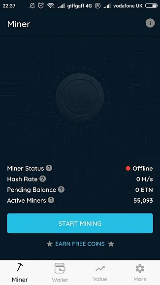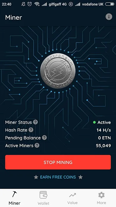 K spusteniu ťažby už stačí iba ťuknúť na „START MINING“ a to je všetko. Práve ste začali úspešne ťažiť svoje prvé mince.