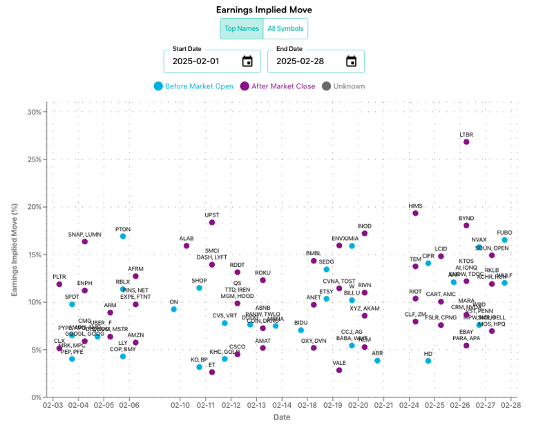 Na obrázku nižšie môžete napríklad vidieť, že trh očakával pohyb akcií spoločnosti Alphabet (GOOGL) o približne 7 %, zatiaľ čo v prípade spoločnosti Coca-Cola (KO) to boli len približne 3 %. Vo všeobecnosti majú technologické spoločnosti tendenciu byť volatilnejšie ako defenzívne tituly typu spotrebného tovaru.