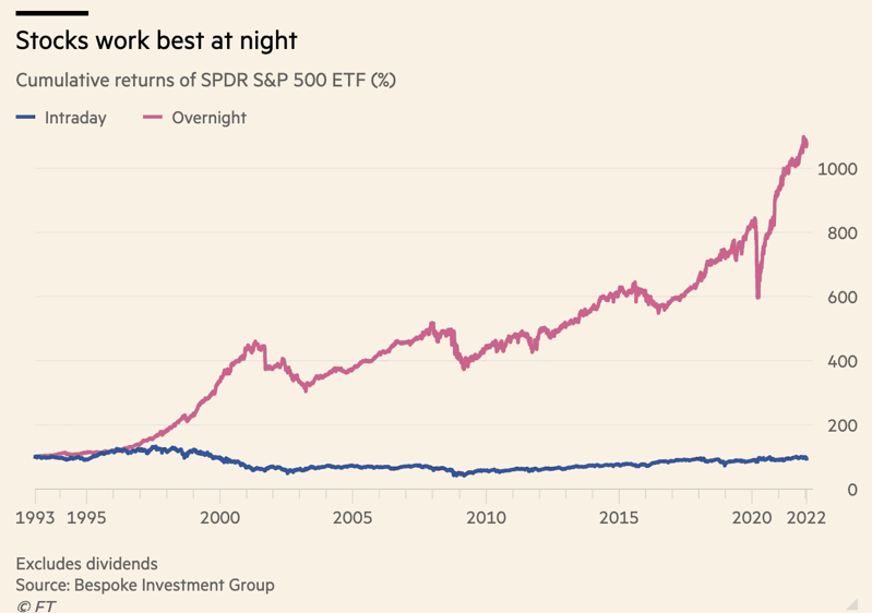 Možno vás prekvapí, že väčšina pohybov indexu S&P 500 za posledných 30 rokov sa odohrala mimo bežných obchodných hodín, najmä po zisku, ktorý spoločnosti vykazujú pred otvorením trhu alebo po ňom. To je dôležité najmä pre tých, ktorí zvažujú obchodovanie na intradennej báze.