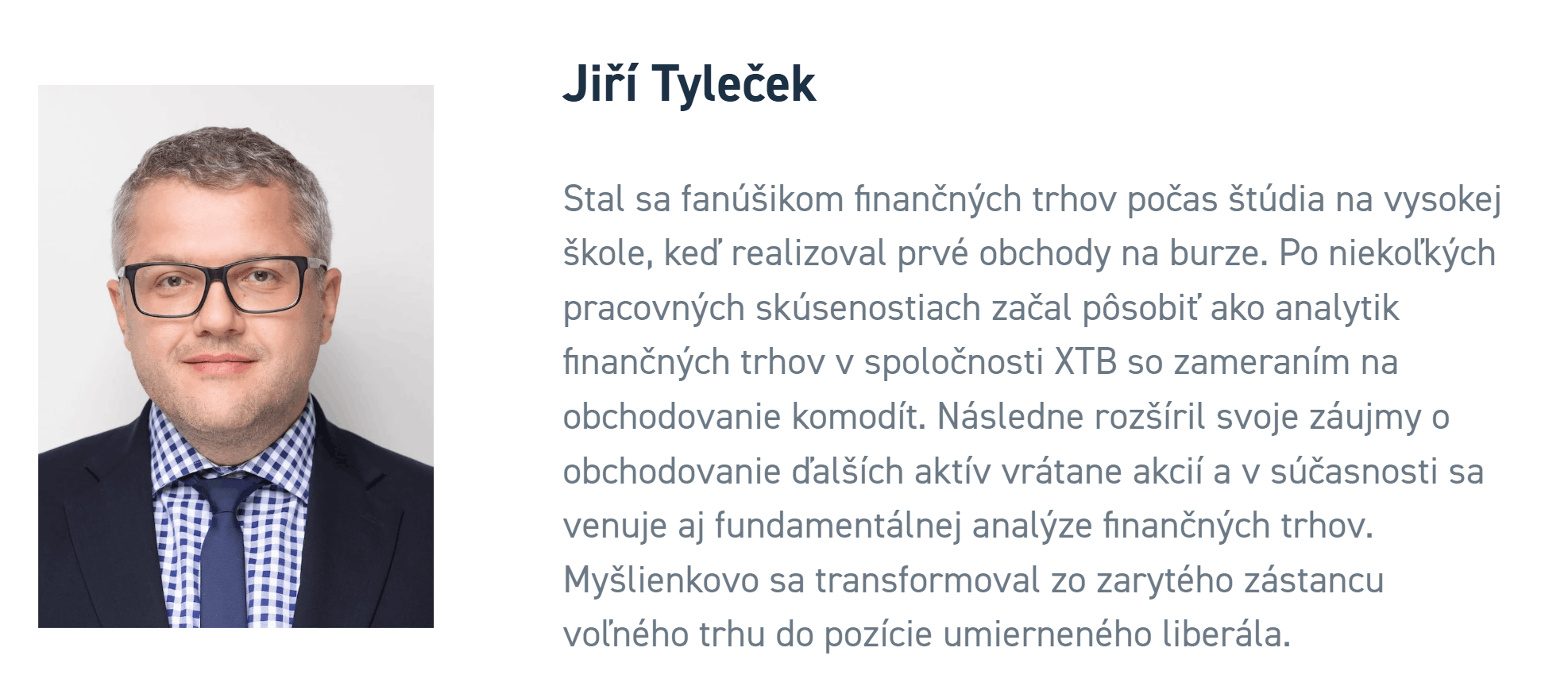 Odpovede na tieto a ďalšie otázky hľadáme u jedného z najkvalifikovanejších odborníkov v Českej republike. Jiří Tyleček, hlavný analytik brokerskej spoločnosti XTB, pôsobí na finančných trhoch už viac ako 20 rokov. Ako vedúci analytického tímu a vyhľadávaný mediálny komentátor sa špecializuje na komodity, menovú politiku a makroekonomické súvislosti. V dnešnom rozhovore odhaľuje, čo stojí za súčasnými pohybmi na trhu, prečo by nás mala zaujímať meď, aj keď s ňou neobchodujeme, a ako zachovať chladnú hlavu v dnešnej „zrýchlenej” dobe.