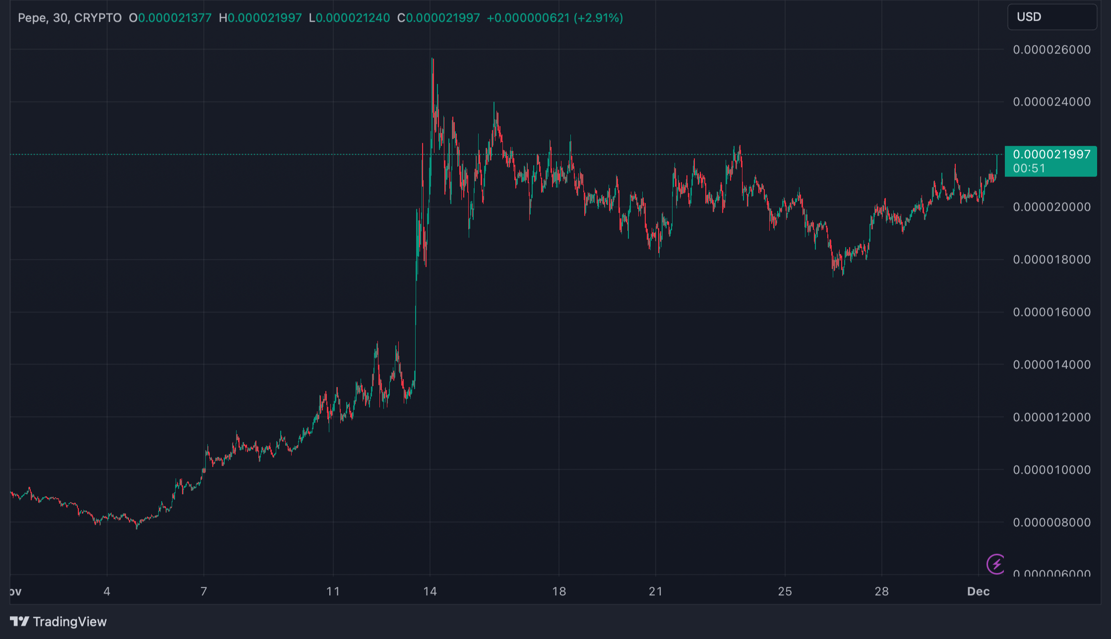 Pepe (PEPE) však zaznamenal za posledný mesiac výrazné cenové výkyvy. Zatiaľ čo obchodné objemy Pepe dosiahli osemmesačné maximum, token zaznamenal pokles o 5,37 %, čo zdôrazňuje vlastnú volatilitu Pepe a širšieho trhu s meme coinmi.